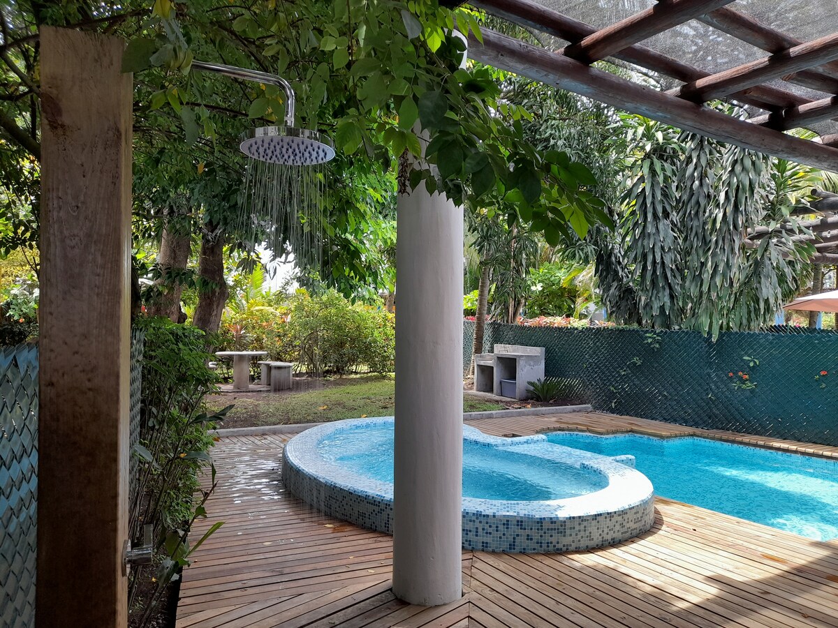Awaken your spirit by the sea. Nestled in El Paredon, Guatemala. This private 2-bed, 2-bath haven intertwines modern comfort and rustic charm, a short stroll from the beach. Embrace practicality with a well-equipped kitchen, hot showers, a sleeper sofa, & agua vida on tap. Immerse yourself in serenity on the poolside or terrace, enjoying the afternoon breeze with air conditioning as an optional companion. Our unique dwelling offers a space for tranquility, find solace by the soothing waves.
