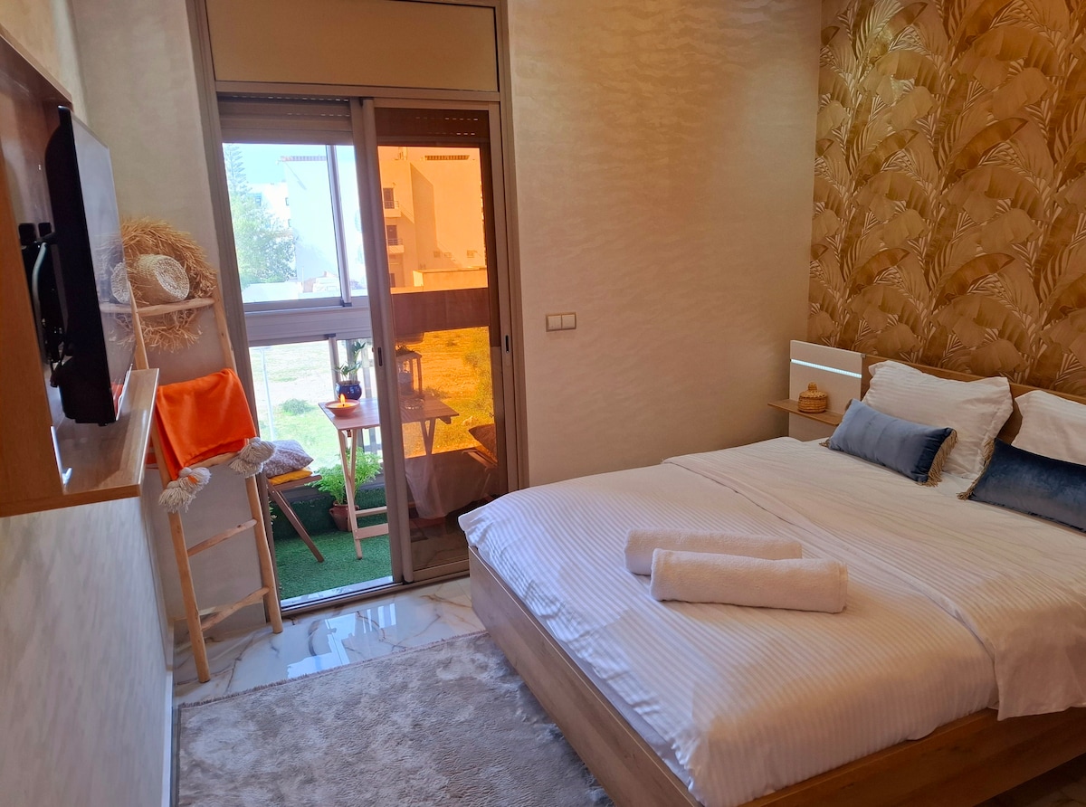 In the tranquil tourist district of Essaouira, this apartment nestled behind the greenery of the forest offers an oasis. Two welcoming bedrooms, one with a king-size bed, the other with two comfortable single beds and spacious wardrobes. The living room with L-shaped sofas and a Smart TV creates a friendly space. The equipped kitchen provides access to a peaceful courtyard. Bathroom and shower with hot water. Enjoy comfort, tranquility, and proximity to nature and the beach