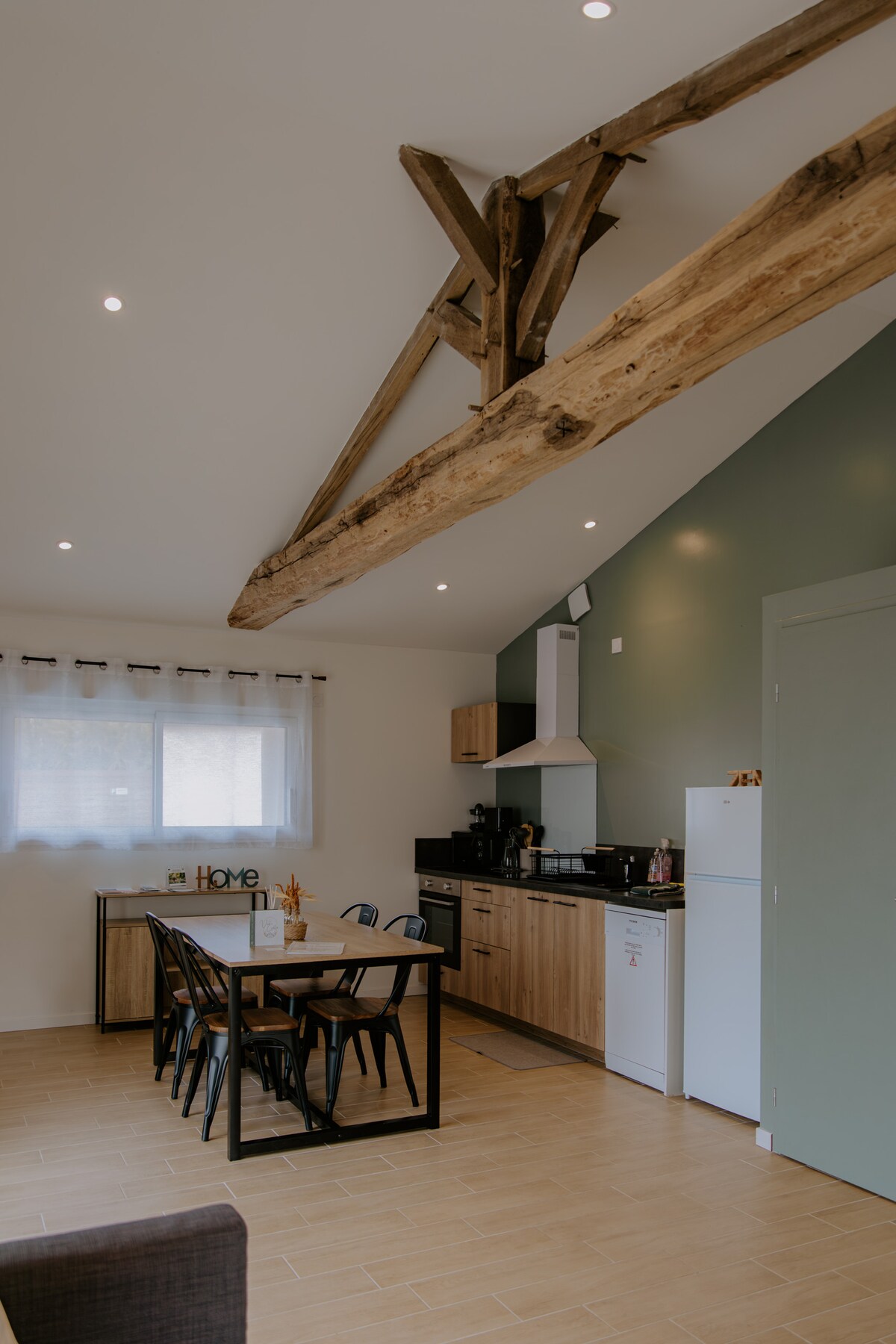 Compliance with the enhanced cleaning protocol established by Airbnb 130 m2 cottage in an old barn on 2 levels. Ground floor: living room with kitchenette and sitting area. Separate toilet. 1 bedroom with private shower room (+ washing machine). Upstairs: 1 bedroom with private shower room + bed for 2 children. Separate toilet. Exterior: 93 m2 English courtyard with garden furniture + barbecue + parasol + sun loungers. Unfenced green space accessible on the cottage side and house side.
