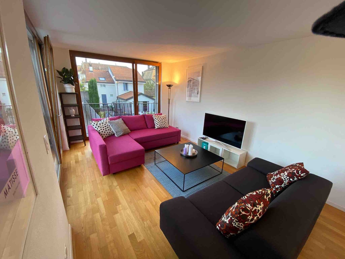 Come and enjoy a unique experience in our city chalet in Annemasse. The apartment is on the top floor, giving you an unobstructed view of the surrounding mountains. After a day of hiking, skiing or working, relax by the fireplace and unwind in the private hot tub. Located 5 minutes from Mont-Salève, 20 minutes from Geneva and 50 minutes from the first ski resorts.