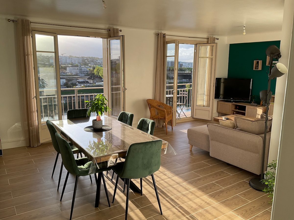 Nice apartment on the banks of the Seine, can accommodate 5 people. You will be seduced by the comfort and brightness and enjoy a large terrace. Ideal for holidays or work. With a capacity of 5 beds (including a bed for a child), this accommodation combines comfort, space and an exceptional view of the banks of the Seine. Easy and quick access to public transport to Paris and all places to visit (Versailles, Disneyland Paris...)