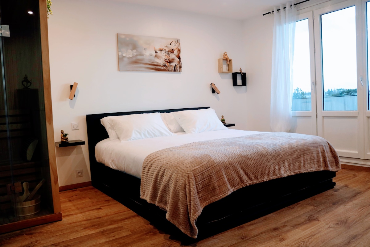Spacious 2-room apartment ideal for lovers. Enjoy a balneotherapy bath and a relaxing sauna. The king size bed (180 x 200) promises dreamy nights. Enjoy meals on the large balcony. Fully equipped kitchen, including washer-dryer. Relax in the spacious shower or on the large sofa bed for two. HD TV and fiber optics offer entertainment and connectivity. Experience unforgettable moments in this peaceful retreat designed for love and comfort.
