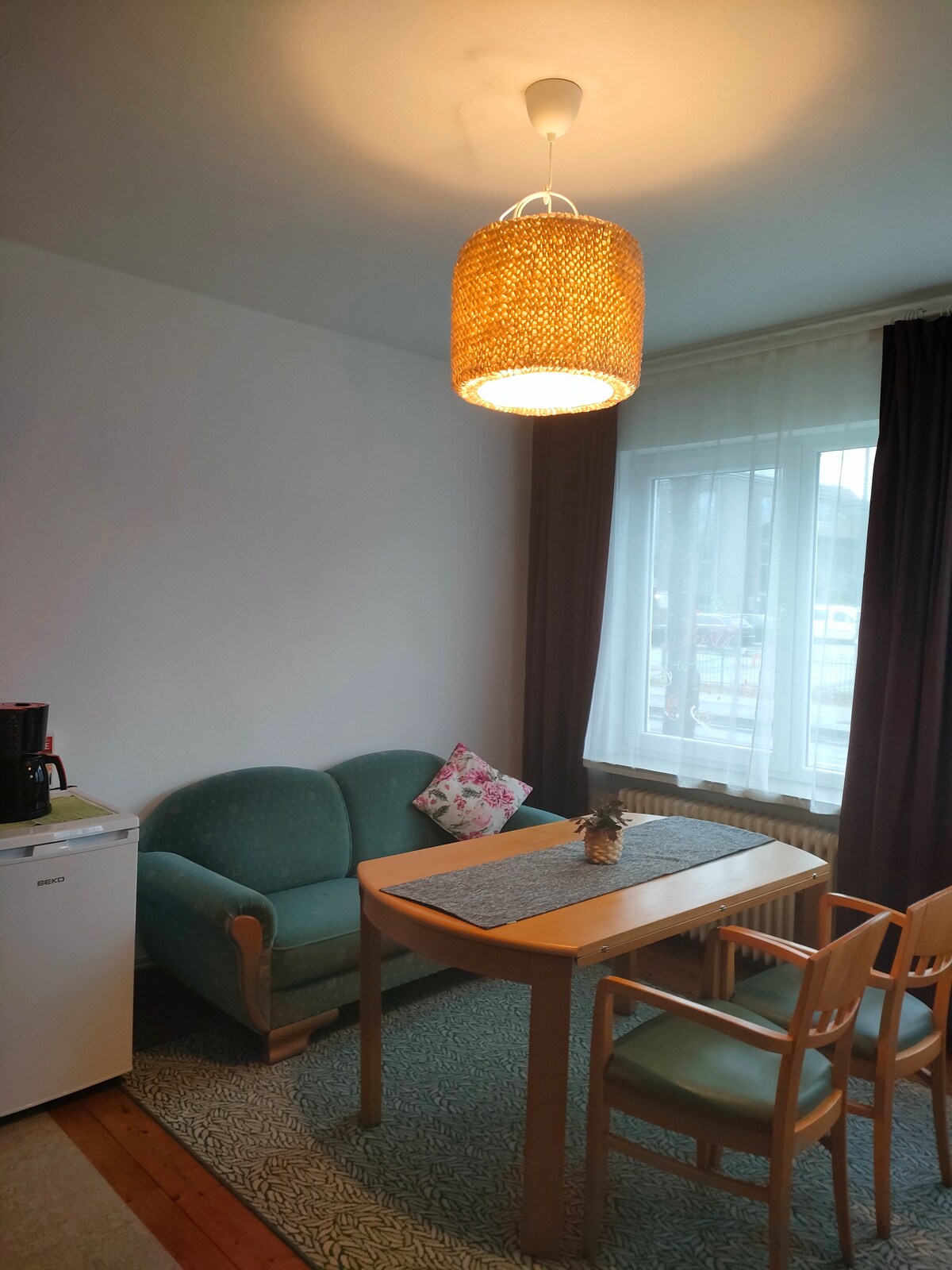 The apartment is centrally located in a quiet residential area. It is located on the upper floor and can be reached via stairs. Consisting of a living area with a sofa bed, cooking and dining area, a separate bedroom with a double bed and a bathroom with shower/toilet adjacent to the bedroom, it can accommodate up to three people.