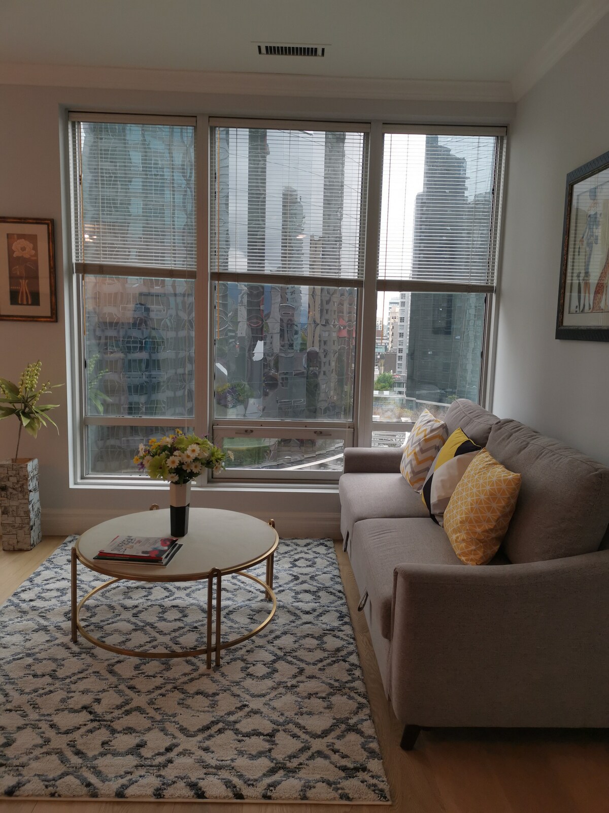 Amazing location, Canadian art, design and a great view. Treat yourself to a 5-star stay - perched high in the sky - right in the middle of downtown Vancouver. Walk everywhere, from mouth-watering restaurants, to shopping and even the seawall a short walk away. Super easy to get to from the airport - just a quick 10-minute walk from the skytrain. This is the perfect place to relax and unwind before exploring the town. This is a chill space though - please, no parties or events.