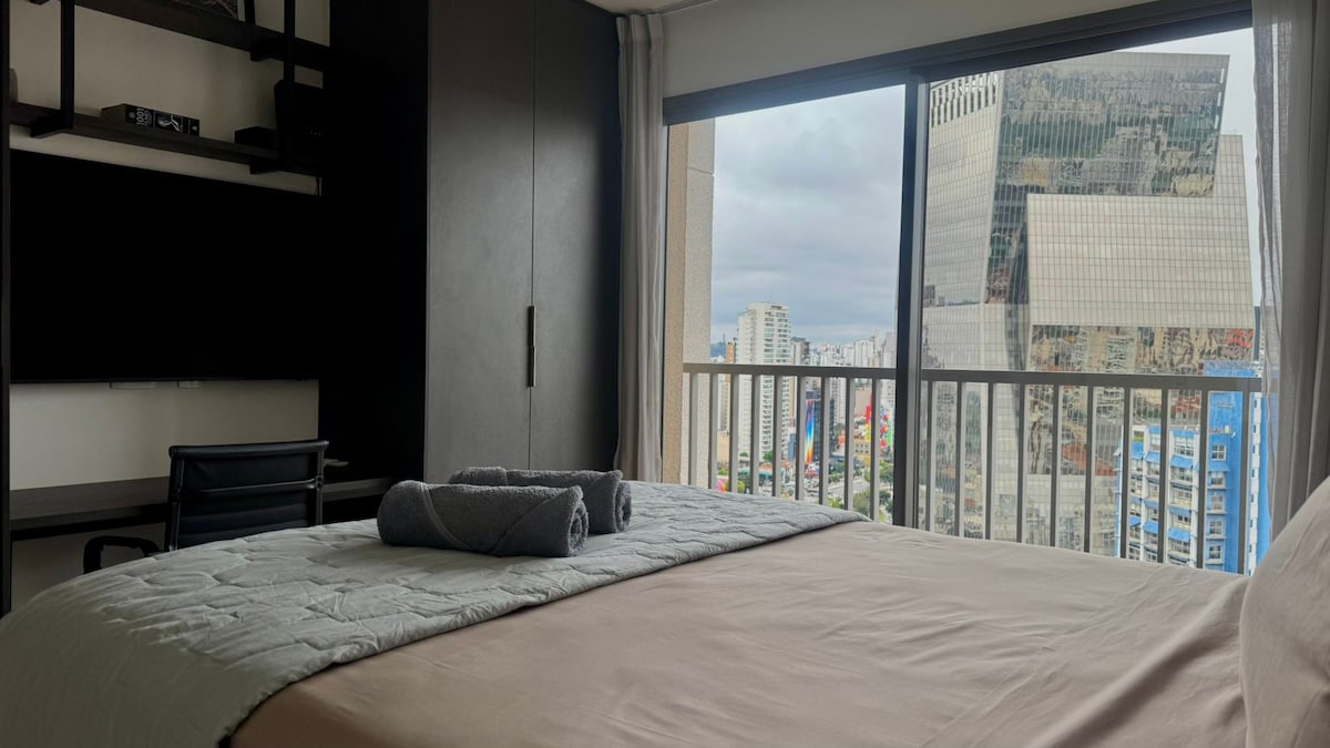 Luxury Studio on Rua Oscar Freire Modern, sophisticated and complete, on the most famous street in São Paulo for luxury stores. Studio on the 24th floor, facing, with magnificent view of Av. Paulista. Well equipped, with 55-inch TV, Vivo Fibra 200 Wifi Internet, cable TV, silent air-conditioning, coffee maker, cooktop and minibar, automated black-out curtain, portable clothes steamer, kitchen utensils, hairdryer, soft sheets and towels, soap and shampoo/conditioner kit.