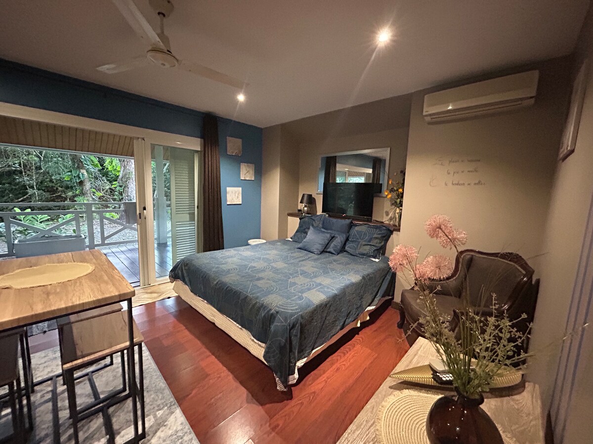 A stone's throw from the Grandes Fougères park, in the exceptional site of the Oasis of Tendéa, your luxurious bungalow "Le Niaouli" awaits you for a wonderful moment of relaxation. In this little paradise, come and enjoy the comfort of your bungalow with its “Balinese” atmosphere, its terrace with breathtaking views of the lush forest of Tendéa, its garden with multiple species, swimming in the river with its superb waterfall including access is private for Nirvana guests.