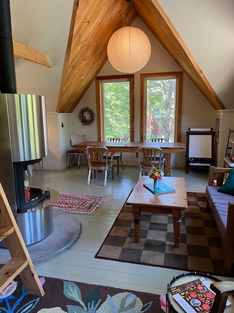 Renovated circa 1920 carriage house in a quaint New England college town. Eight-minute walk to busy downtown with restaurants, bars, shops, and grocery store. Elegant contemporary style. Open concept downstairs with sofa, daybed (napping in the sun!), and chef-designed kitchen. Second level with two queen beds and small balcony. Adjoins miles of walking trails and forest, full of wildlife. Less than 5-minute drive to a 1.5 mile running trail along the Sandy River, with refreshing swimming.