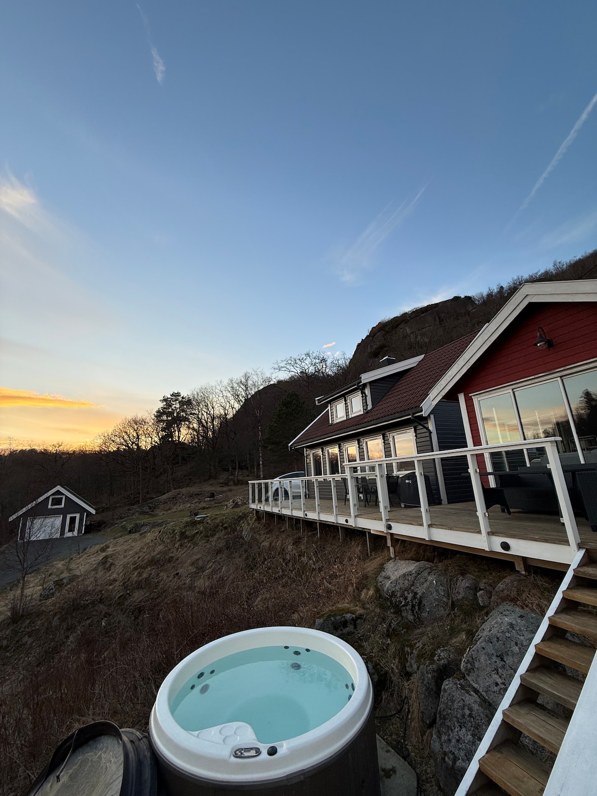 Recharge your batteries with luxury at this unique and quiet accommodation. Beautiful romantic little cottage with views that give peace of mind. Large terrace/jetty with outdoor furniture, gas grill and wood-fired hot tub! (IMPORTANT! The hot tub does NOT have bubbles or massage, just lovely hot water). Inside there is a bedroom with a double bed, bathroom with toilet and shower, well-equipped kitchen and living room with TV. Attic/mezzanine with 2 single beds, 1.80 ceiling height. Free rental of paddleboard and small kayak.