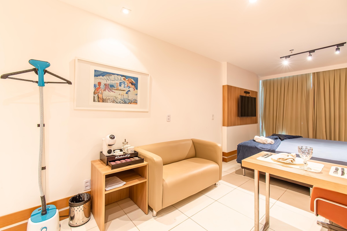 The flat has all the amenities you need and is located in the best hotel area of Brasilia, it has a 43-inch TV, microwave, coffee maker, air fryer, microwave, safe, minibar with freezer and new bedding. With easy access to Brasilia Shopping and exclusive restaurants such as Vasto, Madero, Paris 6 and Coco Bamboo, the space has an excellent location, an incredible and remarkable view in the heart of the Federal District. The hotel's infrastructure includes a restaurant, gym, swimming pool and parking space