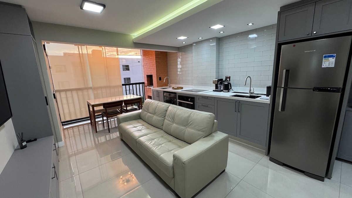 Modern and equipped apartment with stunning views, especially for the sunset. Excellent location, close to pharmacies, gym, UPA, bakery and fruit shop. Parking included. The condominium offers a market and pet space. We prioritize recycling, with specific bins. It has a TV in the living room and bedroom, plus a Nintendo for fun. The home office is well equipped, with an extra screen, mouse pad and gamer chair. Air conditioning in the living room (cold) and fans/heaters in the bedrooms.