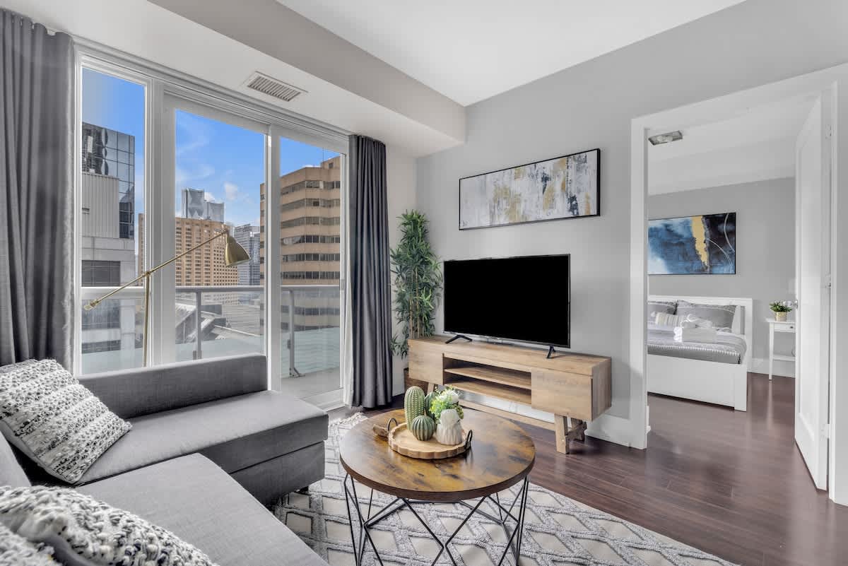 Experience modern downtown living near the CN Tower, Scotiabank Arena, and the waterfront. This bright, open-concept condo offers a full kitchen, comfortable lounge, and floor-to-ceiling windows. Enjoy free Wi-Fi, fresh linens, and professional cleaning. Perfect for business or leisure, you're steps from top dining, entertainment, and easy transit. Valid ID is required at check-in; quiet hours run 10 p.m.–8 a.m. Book now and enjoy Toronto!