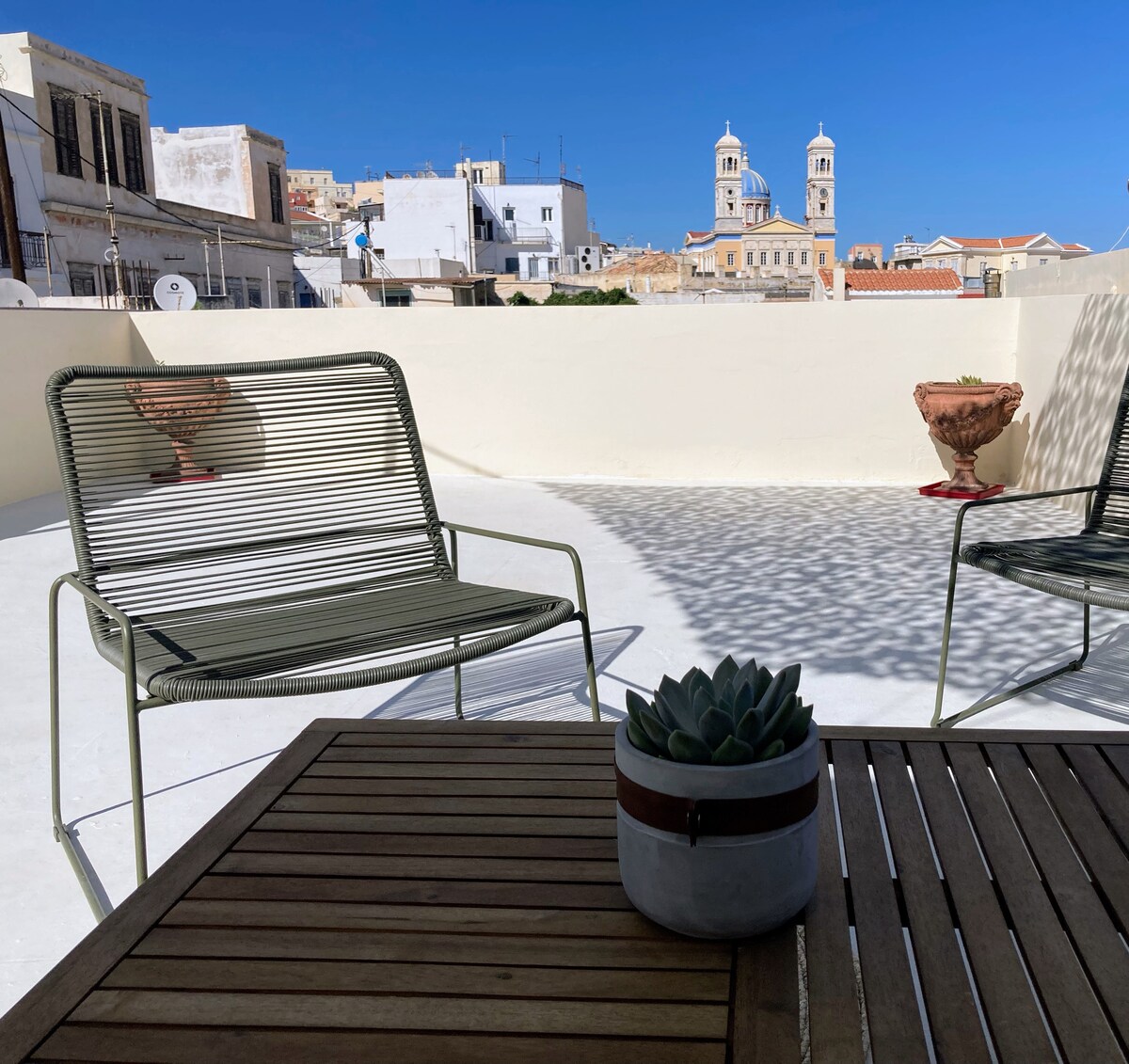 Situated right in the heart of Hermoupolis, just a minute away from the city' s main square or the famous Apollo theatre and only a five- minute walk away from the Vaporia district with Saint Nicholas church as its most prominent feature. Charlie 3, is a spacious apartment of 67 square meters with its very own roof terrace where you can enjoy your morning coffee or a late night drink. It is on the 2nd floor and there are stairs. There is luggage storage available.
