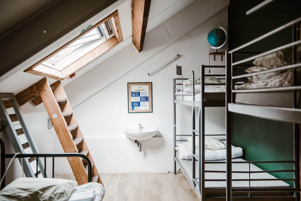 In this dorm you will sleep with maximum 5 people in the room. There are lockers and a sink in the room. Showers and toilets are centralized in the hostel.