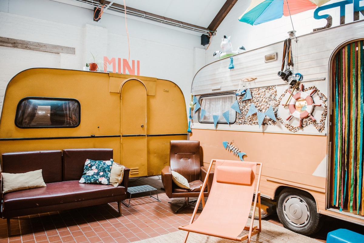 Our smallest & cutest caravan. We don't really know if it's a two person or a one person bed...We do know that there's a lot of authenticity in this one; the curtains, the lights, the bench,.. they are all like they were years before. This one is perfect for couples who like to cuddle all night long or travelers who like to have the bed/ caravan for their own.
