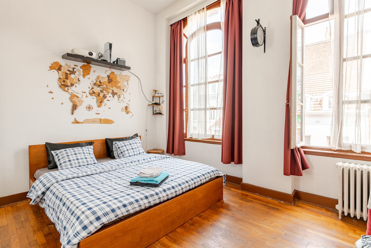 Warm and stylish 80m² flat near city heart, set in a quiet building with lift. Prime spot: 15 min to BRU Airport, steps from the train, stroll to Grand Place. Inside: Two calm, cozy bedrooms plus a single bed, separate toilet, full bath with tub, washer, dryer, fitness gear, flat-screen TV, projector, Hi-Fi, board games, fireplace. Bonus: Private underground garage just 100m away, on the same street.