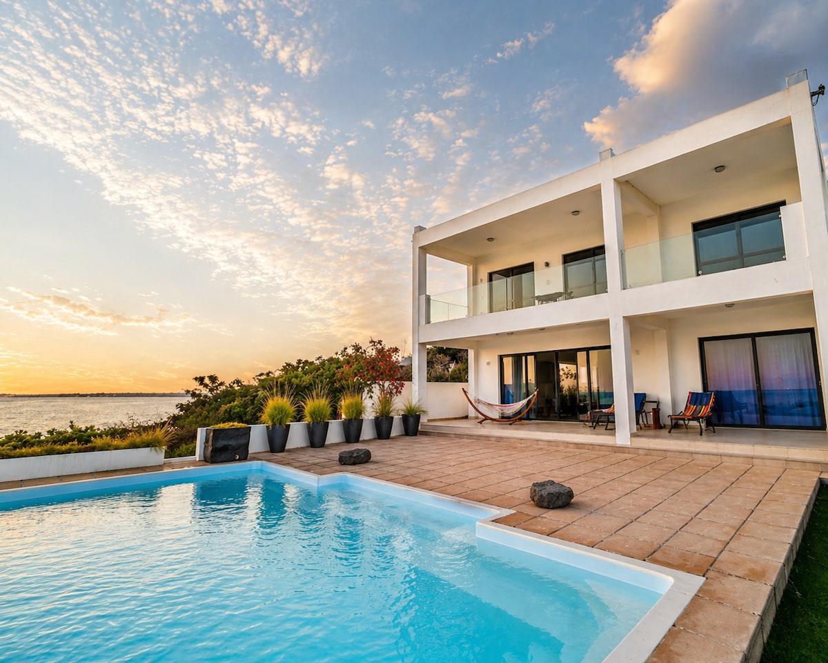 From the terrace, you will have magnificent views of the mountains of southern Mauritius and to the west, a corner of the sea where you can admire the sunsets while relaxing in the jet pool, perhaps after a visit to the sauna. Then, you will dine under the starry sky, before moving on to the large, comfortable and perfectly ventilated living room. You will fall asleep peacefully in one of the three air-conditioned bedrooms, each with its own bathroom.