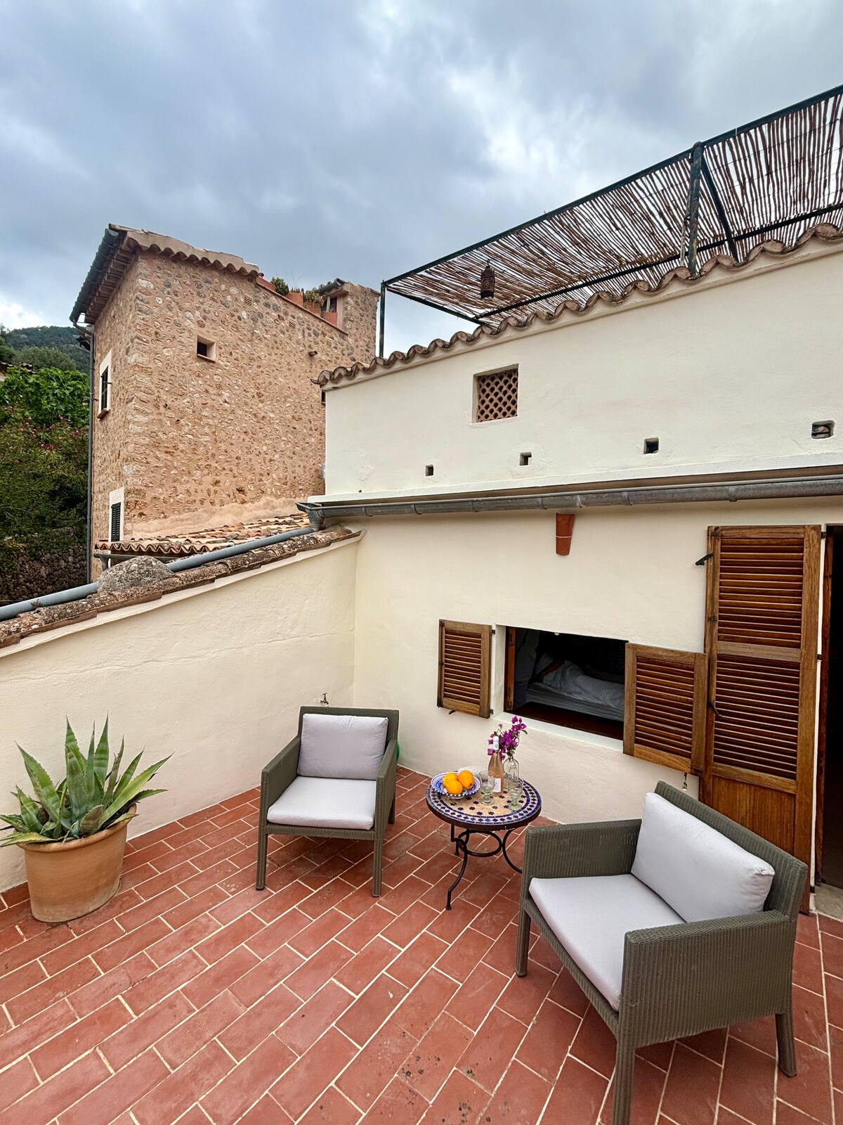 A stunning 1 bed accommodation with terrace overlooking an orange grove set within a 400-year-old finca. Bedroom with living area, shower room, kitchen within the picturesque village of Fornalutx. Stylish with aircon/tv/WIFI.