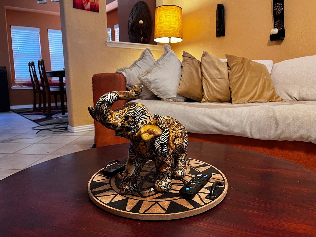 Kendeja is a unique 2-story, 4 bedroom house decorated with African theme artifacts and named after a Liberian West African village the host lived in as a Peace Corps Volunteer. THE GRIOT KING MASTER SUITE is handicap-friendly with a king size bed; personal mini fridge; bathroom suite w/ a garden tub, glass shower stall; shower chair and huge walk-in closet. THE BLACK PANTHER SUITE comprises the entire 2nd floor with 3 bedrooms, a full bath; kitchenette, office desk, family room.