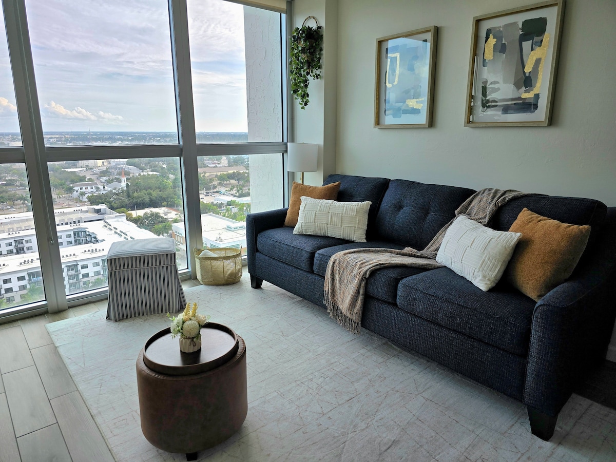 Welcome to Level 19, a modern 19th-floor retreat in Downtown Fort Myers. Enjoy beautiful skyline views, warm décor, and a fully equipped kitchen. Relax in the living area with Queen sofa bed and unwind at the pool, hot tub, or gym. Designed for comfort, this King suite hosts up to four guests. City Views | Pool | Hot Tub | Gym | King Bed | Queen Sofa Bed | Wi-Fi | Smart TV Dining: 2–5 min walk | Edison & Ford 5–10 min | Fort Myers Beach 25–30 min | RSW 25 min