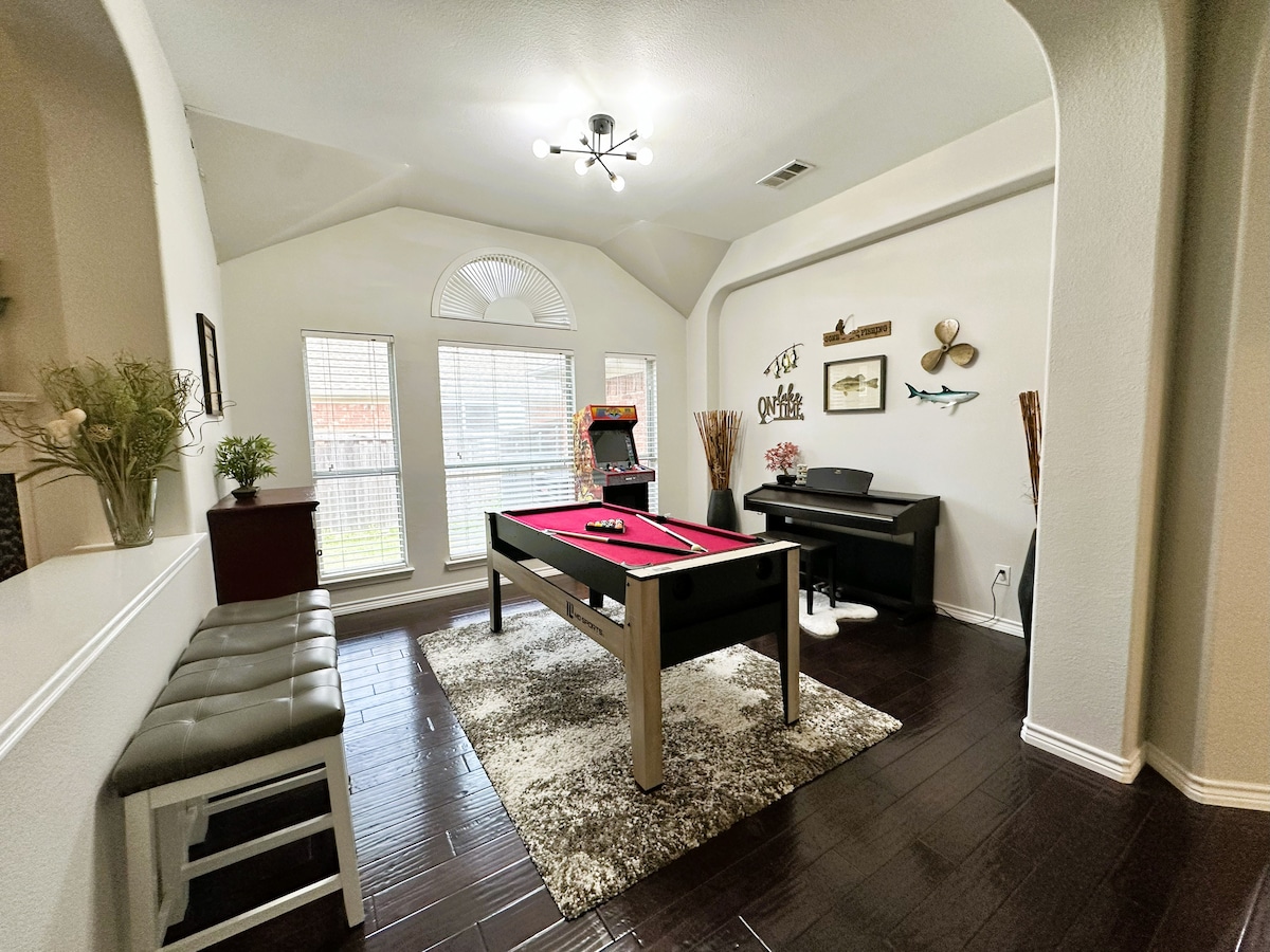 This spacious home is located conveniently in Grand Prairie, Texas with easy access to shopping centers and major attractions. With just a little over 3300 sqft of living space, this home sleeps up to 12 with 5 bedrooms and 3 full baths. In addition, a private office, mudroom, multiple entertainment areas, a piano, and high speed internet. This home is perfect for family gatherings or work trips. Close to major attractions. Welcome to the Brazoria House of Grand Prairie!