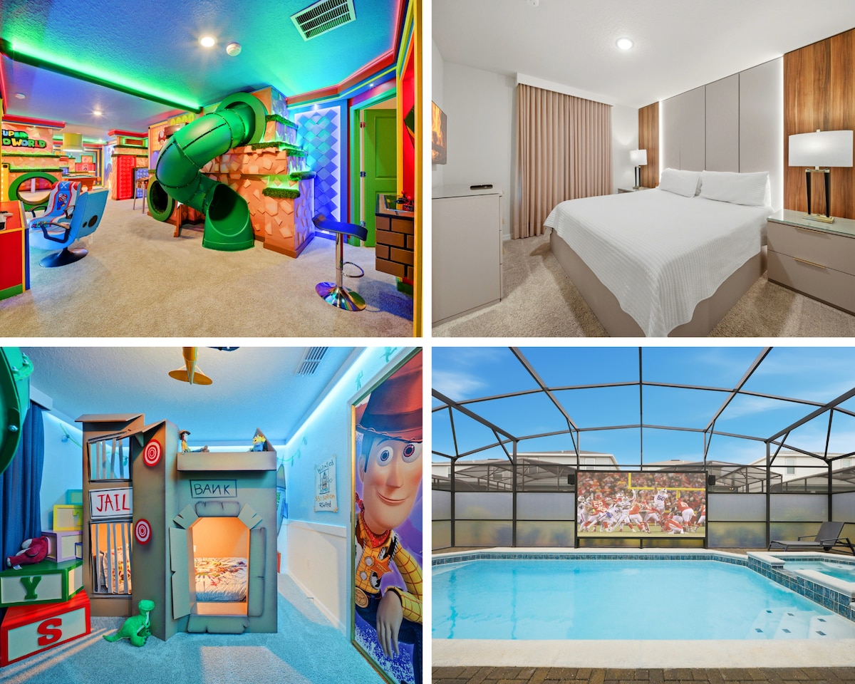 Stylish Design, Luxurious Comfort & Endless Entertainment, with a sprawling 2200 ft2 southwest facing pool deck & outdoor kitchen, no rear neighbors on a beautiful forest in the stunning 3.5 square mile Reunion Resort. You will have your own private pool with overflow spa, movie room, billiards - game room, 4 theme rooms: OUTER SPACE, MARVEL SUPERHEROES with a TUBE SLIDE, FROZEN II, HARRY POTTER CUPBOARD, PS5, within minutes to Disney.