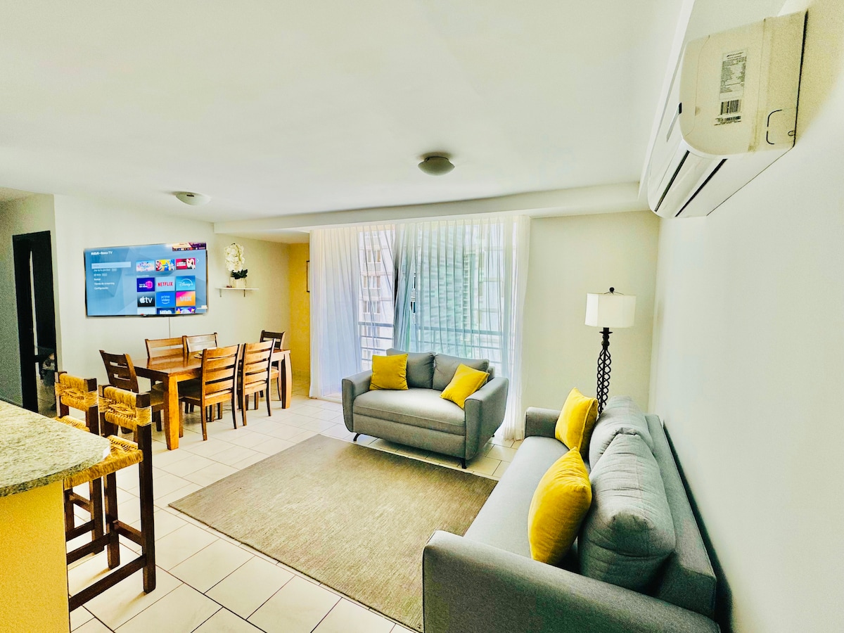 • Luxurious and secure apartment • 15 min from the U.S. Embassy • 2 bedrooms, each with a private bathroom, blackout curtains, and A/C • Fully equipped kitchen • Free washer and dryer • 3 Smart TVs with Netflix • Furnished terrace + complimentary coffee • Walking distance to Multiplaza, banks, and restaurants • Ideal for 4 guests (up to 5 with the sofa) • Pet-friendly • Pool available for stays of 10+ nights, according to the building’s internal regulations