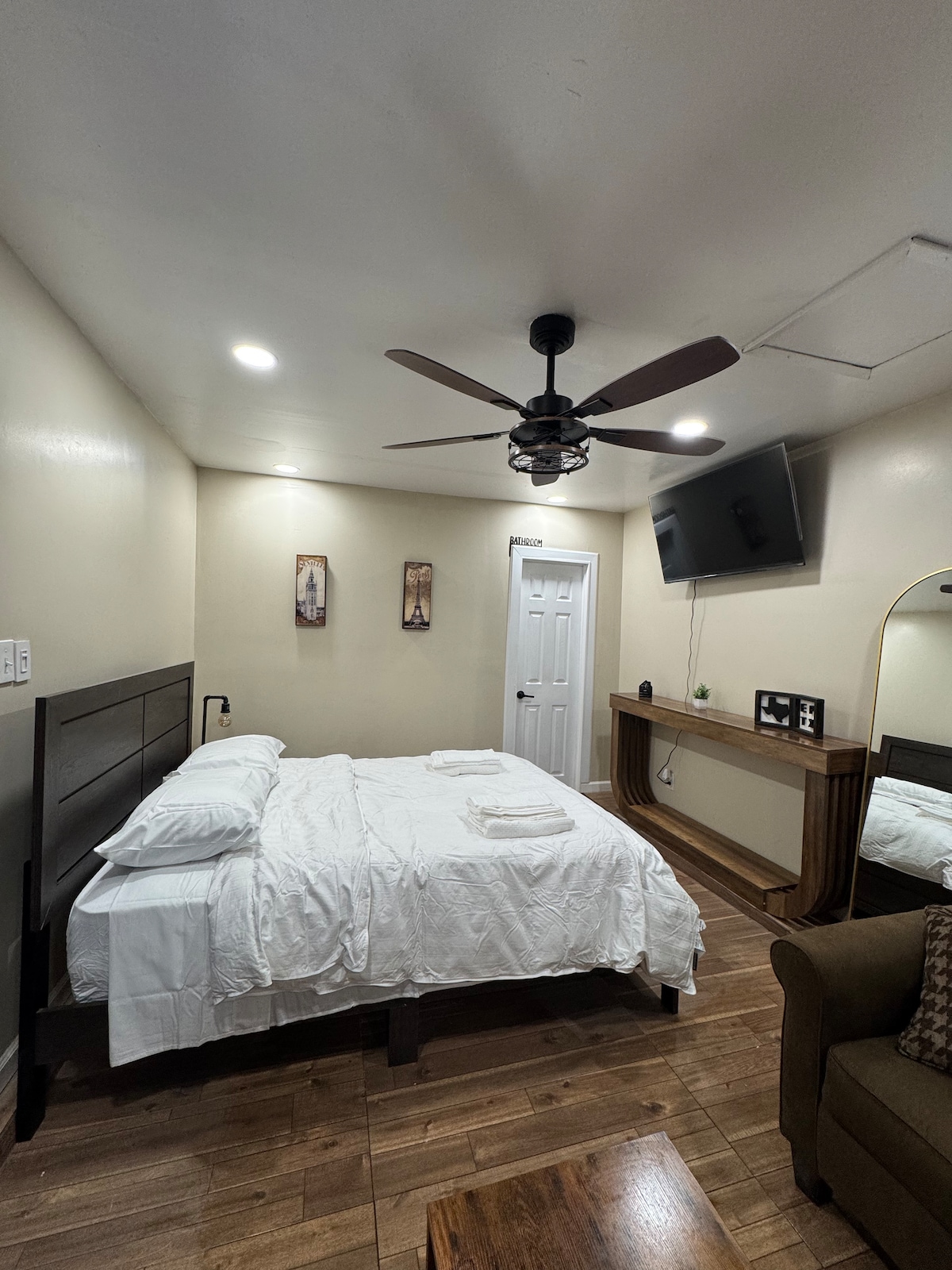 1 bedroom -Queen bed, 1 bath, couch, kitchenette, courtyard. Brand new 55" smart TV, high speed Wi-Fi. Studio located in West El Paso close to I-10. The Kitchenette is equipped with refrigerator, microwave, convection toaster oven, coffee maker, double burner electric cooktop, blender, 2 slice toaster, cooking ware, plates, cups, glasses, silverware, etc. High chair and pack'n play are available upon request.