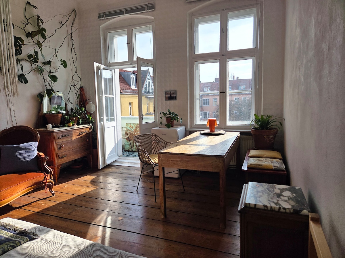 This renovated, light-flooded appartment is situated in one of Berlins most popular neighborhoods and yet is a quiet oasis in a calm street with a beautiful shared garden. The flat consists of a spacious living room with a micro kitchen, a comfortable sleeping room and a bathroom with a walk-in rainforest shower. The place is best suited for 2 guests but contains a convertible sofa that could host 1-2 additional guests. The perfect place to recharge from your visit of this exciting city!