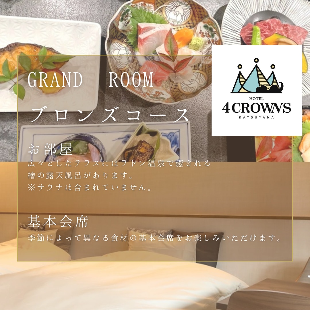 【GRANDルーム】 木のぬくもりを感じる宿泊部屋が最大4名様までご利用可能です。 室内には畳の小上がりもあり、ゆったりお寛ぎいただけます。 広々としたテラスにはラドン温泉で癒される檜の露天風呂があります。 【アメニティ】 歯ブラシ / マウスウォッシュ / カミソリ / 櫛 / アメニティキット(綿棒 / コットン / ヘアゴム) / ボディタオル / 糸ようじ / 男性用ヘアリキッド / シェービングフォーム / アフターシェーブローション / 女性用フェイスケアセット / シャンプー、コンディショナー、ボディソープ / Panasonic製 ドライヤー 【ブロンズコース 夕食内容】 ◆基本会席 季節によって異なる食材の基本会席をお楽しみいただけます。