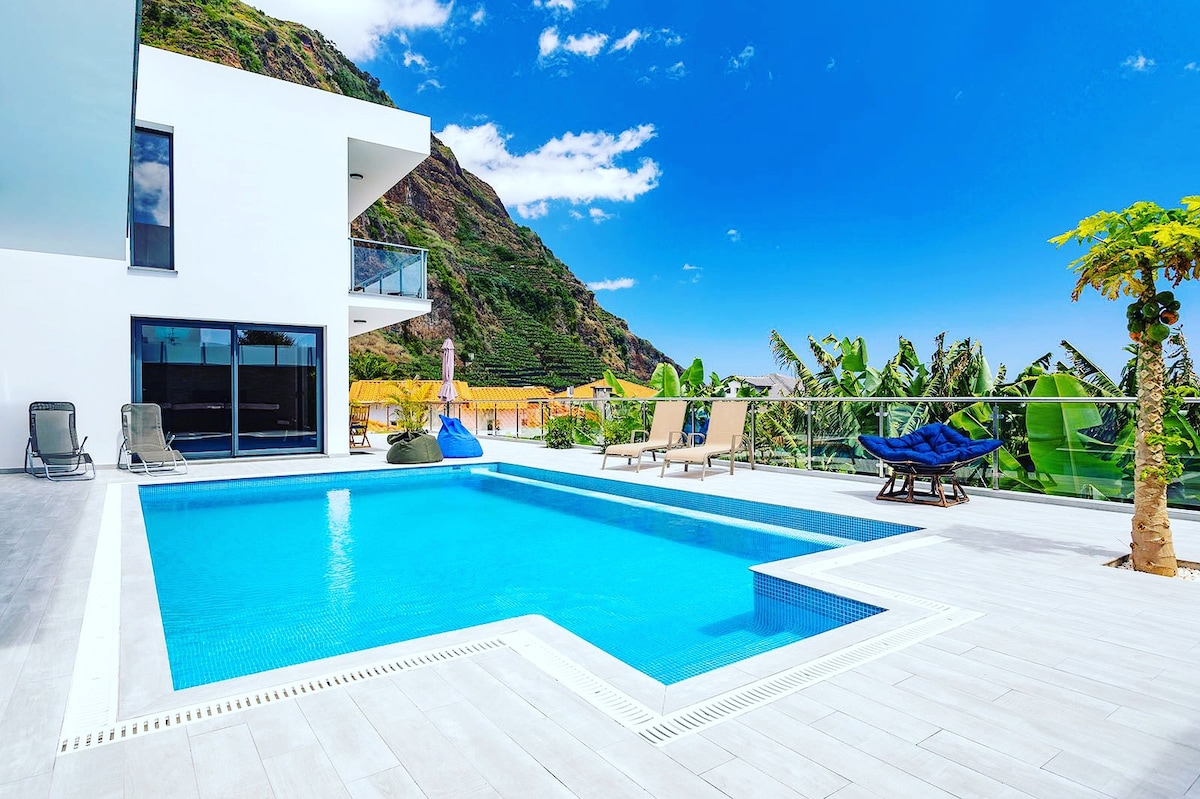 This magnificent, modern, private villa Miradouro da Baleia (Whale Watchtower) has some of the best ocean and mountains views on the island, with a infinity pool and located in a premium spot surrounded by spectacular cliffs, cropland, banana plantations and vineyards, it was carefully & tastefully restored/built in 2018 offering a unique experience of a Portuguese summer style accommodation!
