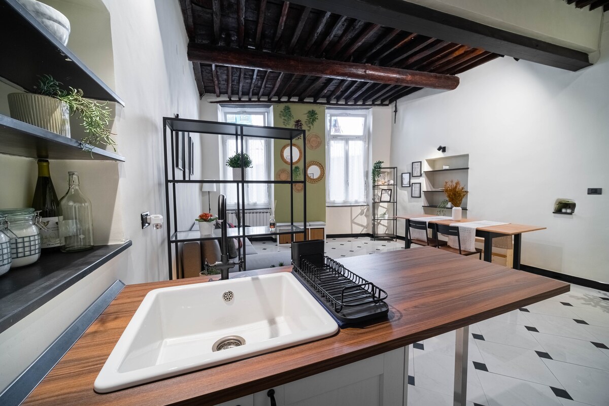 Imperial apartment with an elegant design and original frescoes, the two majestic windows offer a spectacular view of the famous Palazzo San Giorgio. The apartment stands out for its refinement and for the unique character given by the mezzanine, which houses the sleeping area. The stairs leading to the mezzanine are adorned with historical frescoes and ancient exposed wooden beams, immersing the guest in art and history.