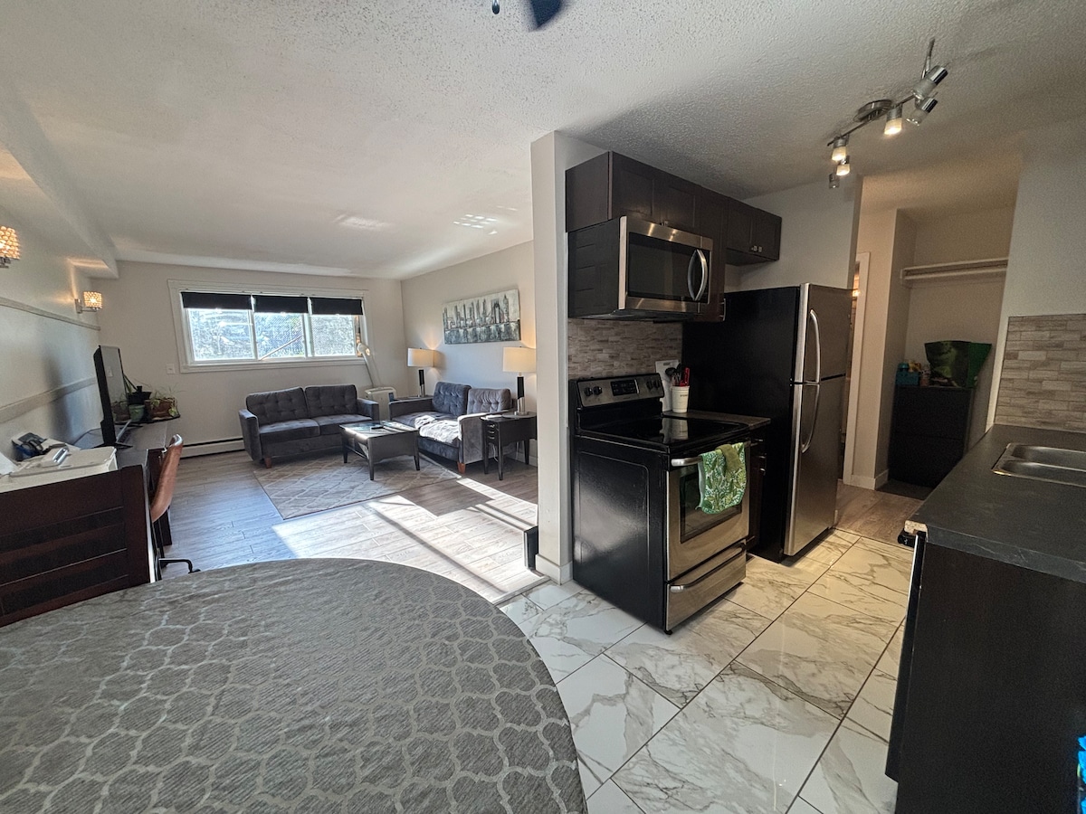 A fully equipped kitchen and cozy furnishings are perfect for longer stays. Use the pool and gym to maintain your excercise routine while you're travelling. Enjoy easy access to everything from this perfectly located home base. Take in stunning views of the city skyline from the balcony. You are just steps away from some of the city's best restaurants, cafes, and entertainment venues, walking distance to Rogers Place, MacEwan University and a quick transit to the University of Alberta.