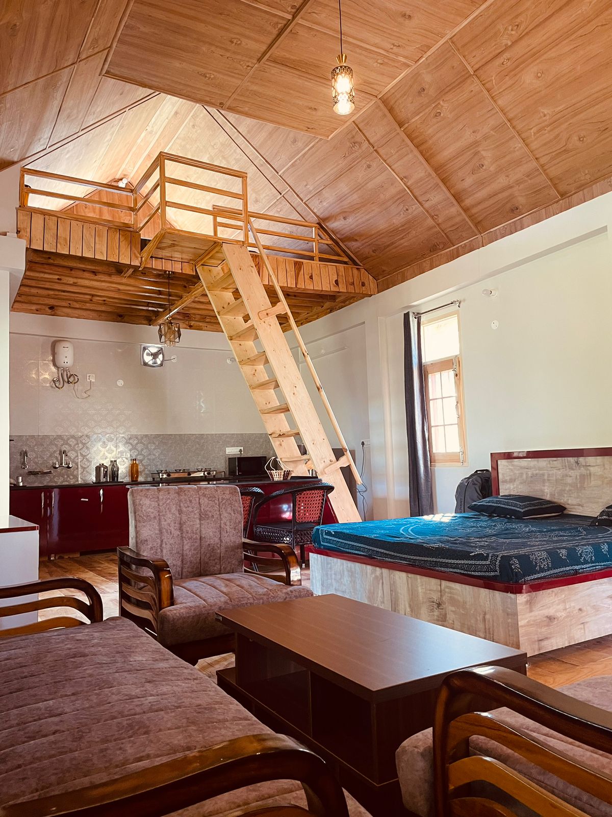True Tranquility! The Cottage is a serene and peaceful retreat, overlooking wide pasture of land. The house is designed with huge glass glazing to get full view of the valley. The traditional wooden ceilings keep the room cool in summer and warm in winter. The Cottage has one Bed Room and a living room at the Ground Floor and the second Bedroom is situated on the first floor having independent entry from outside. There is a beautiful open terrace looking out over valley.