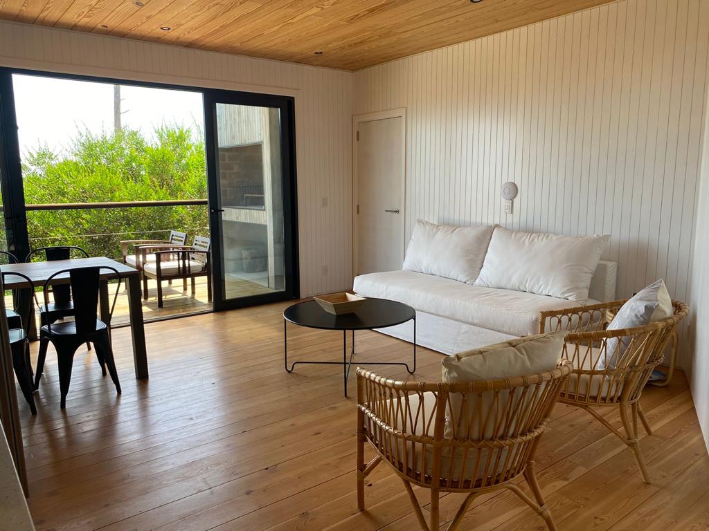 Relax in this unique and quiet getaway. 5 minutes from José Ignacio, this charming retreat is in the Santa Monica forest area. The space offers maid service every 3 days. It is a small cabin with a living room and exit to the deck, a well-equipped kitchen and a bedroom with its en-suite bathroom. It has air conditioning in the bedroom, wifi and linen. Two bicycles available.