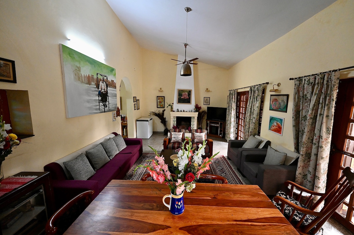 Enjoy the lush greens, open spaces, private courtyard, plunge pool, patio for a memorable vacation. There is adequate seating arrangements on the lawns as well as the open paved courtyard which offers privacy. A DIY barbeque is available within the premises alongside a kitchen with cookstove, microwave, refrigerator and cutlery. The living room has a polk audio music system which can be connected over bluetooth.