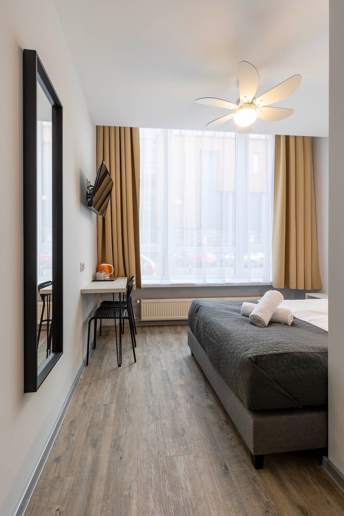To w pełni umeblowane standardowe studio jest wyposażone w wygodne łóżko, stół i krzesła, szafki, oświetlenie oraz wszystkie niezbędne urządzenia kuchenne. Dodaj swoje osobiste akcenty, aby uczynić je naprawdę swoim. Sprytny układ łączy kuchnię, sypialnię i łazienkę w praktyczną przestrzeń z przytulną atmosferą.