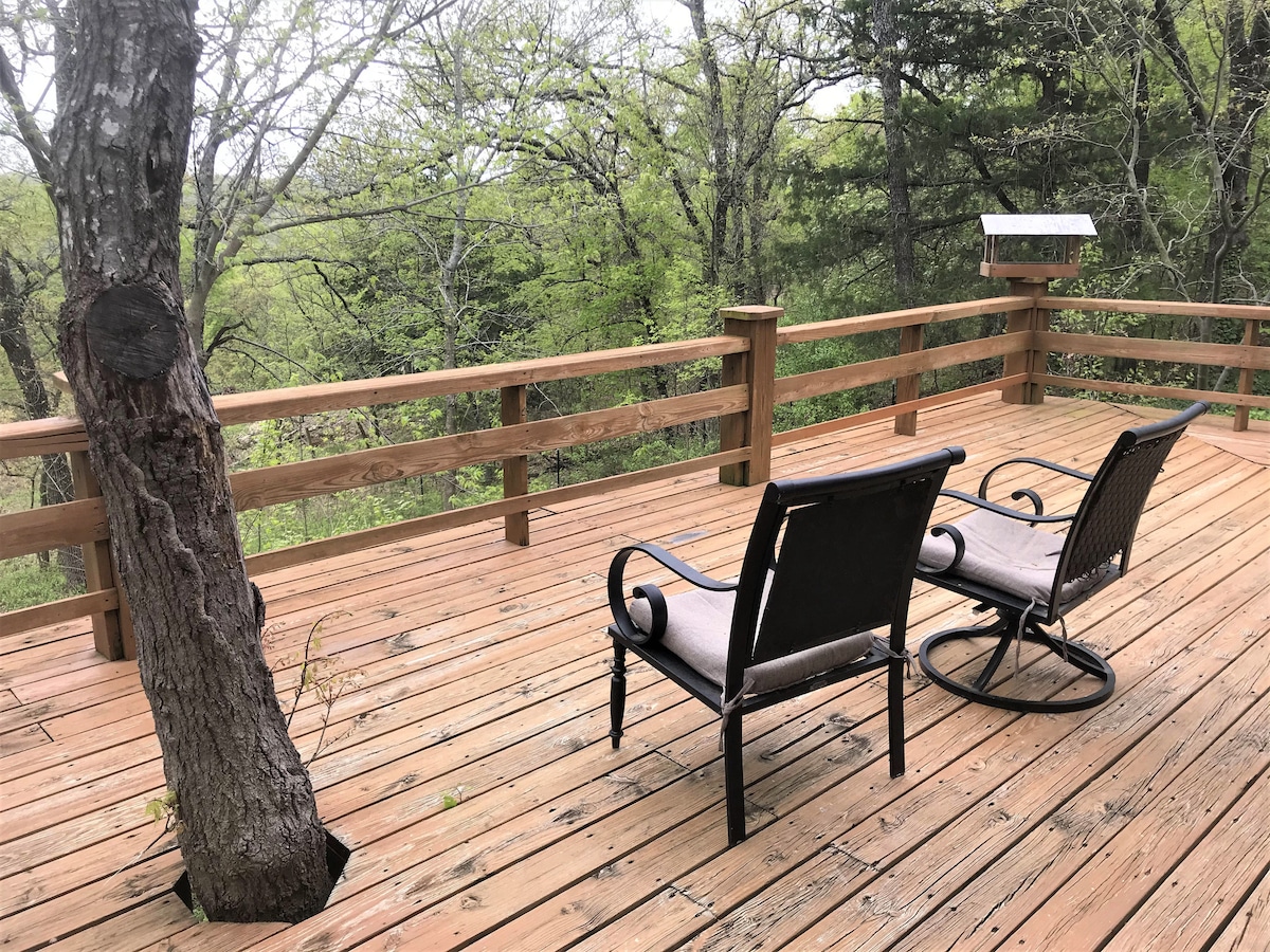 3.5 miles from Turner Falls, elevated 15 feet above ground, "Bird's Nest" first welcomes you with an enchanting view of the Arbuckle Mountains. Then surrounds you with all the custom-built details for a fine getaway, including a pebble stoned walk-in shower and a seperate spa bath. The 70 acres of pristine beauty of nature, shared only with three more cabins, is a destination itself many guests commented:)There is plenty of room for everyone to explore! ~No children allowed due to elevation~