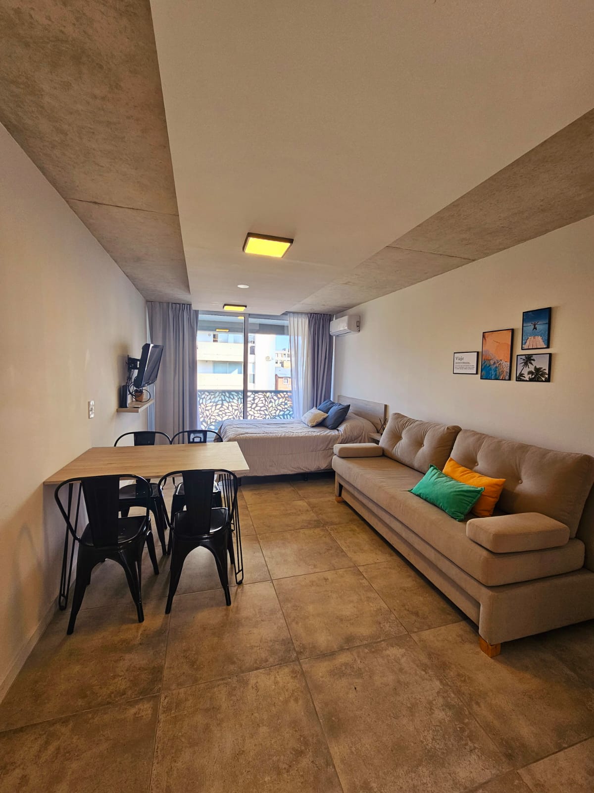 Exceptional studio apartment for 3 people. Window to the outside. Hot-cold AC. Cable TV and WiFi. Kitchenette with full dishes, microwave, coffee maker, stove and toaster Bathroom with shower box (disabled). Indoor/outdoor and outdoor heated pools. Solarium. Sauna, Gym and Relaxation Room. Microcine. Covered garage. Does not include hygiene items or maid service (can be hired separately). Located 40 m from the entrance walkway to the sea and 600 m from the Mall.
