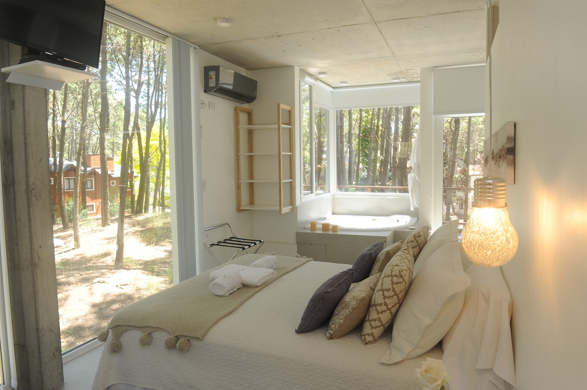 La suite integra interior y bosque con grandes ventanales y vistas hermosas que relajan.Tiene jacuzzi doble vidriado al bosque, terraza con parrilla, kitchenette y baño con antebaño. Ubicada a una cuadra y media de la playa y a la vuelta del centro donde disfrutar de una amplia oferta gastronómica con solo caminar unos pasos. Te espera decoración minimalista y elegante, bandeja de bienvenida y atención personalizada de los dueños.