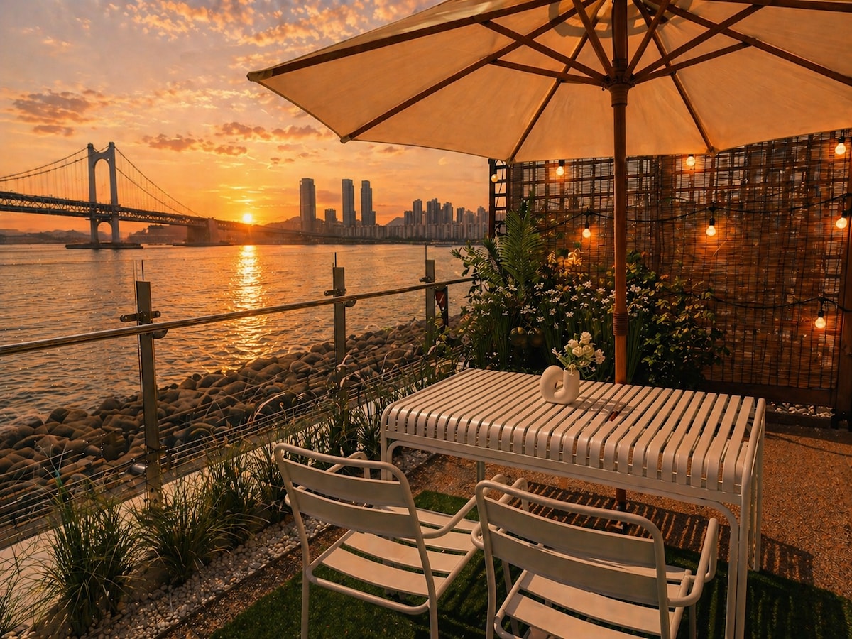 ❤️ Recently, the room has been expanded 2 bedrooms, 1 living room You can sleep comfortably with 1 queen bed and 2 double beds:) Thank you for visiting Anri villa. A fantastic bridge view (full ocean view) where you can see the🎇 nearby Gwangan Bridge Viewable from both the💕 living room and the bedroom Healing full ocean view and Gwangan Bridge view "Leave a life shot"💖 As a newly built 66m2 premium class accommodation👍 Daily laundry, sterilization, disinfection, and cleaning are our top priorities.😉🎇 Free parking lot on the 1st to 3rd basement floors in the🍃 accommodation building (private) Enjoy Netflix🍃, YouTube, and more on your Smart TV. 🍃Right next to Millet Market, 10 minutes by car from Haeundae There are amenities such as a cafe and wine shop on the🍃 first floor. 🍃🍃 Anti-stress tea (organic), hand-drip coffee, and incense are prepared. If your mind is complicated, I hope it will be resolved a little with warm tea and fragrance.