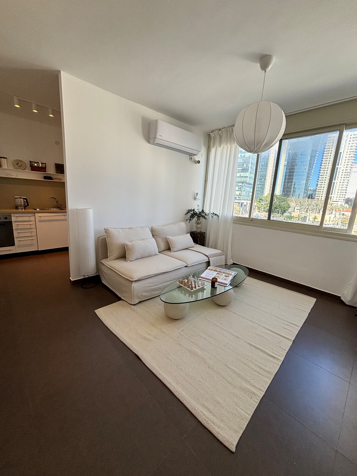 Bright and cozy 1-bedroom apartment in central Tel Aviv, designed with stylish furniture and curated decor. Enjoy a beautiful city view, plenty of natural light, and a comfortable bedroom perfect for rest. The apartment includes a washer-dryer combo, fully equipped kitchen, and a calm, well-planned living space. Ideally located near HaShalom train station and Yehudith metro for easy access to the entire city. Ideal for city stays.