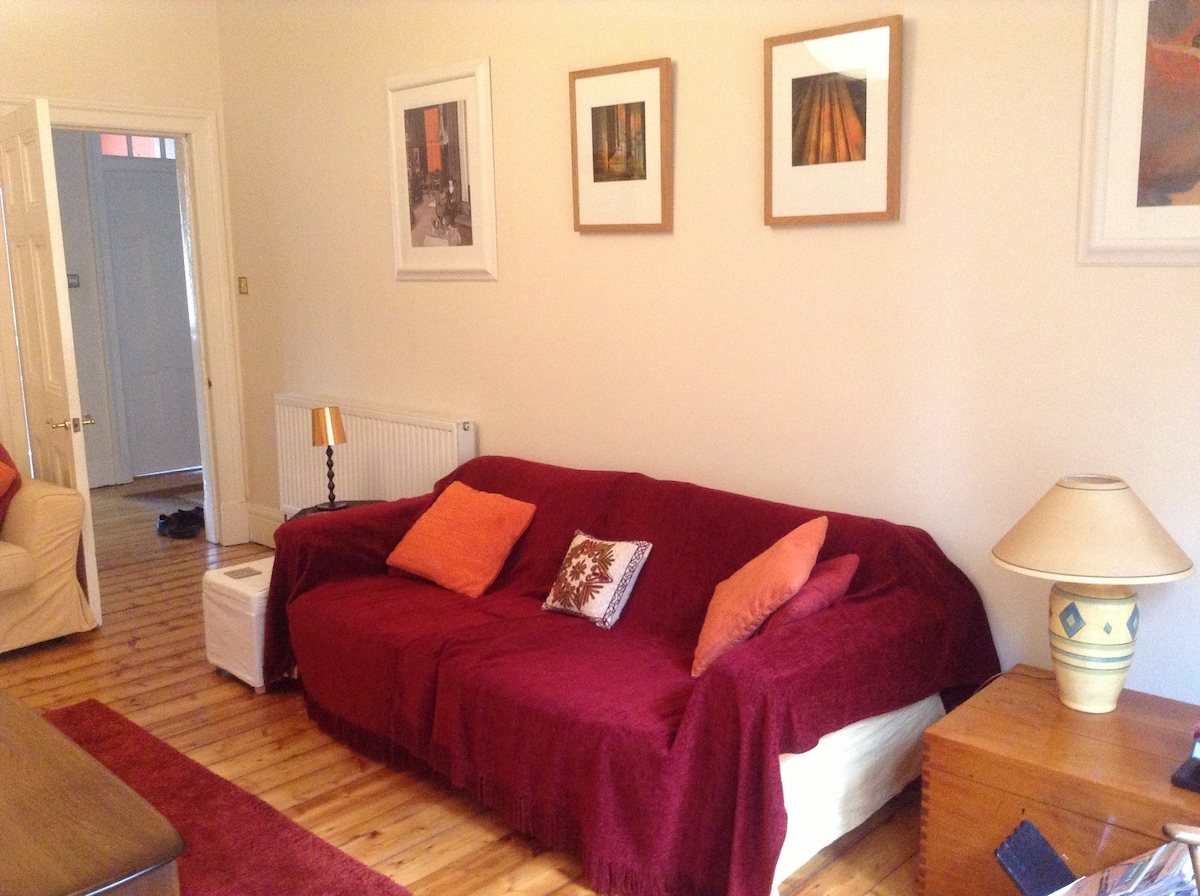 Spacious garden flat with its own entrance, which is per garden off Belhaven Terrace Lane, postcode G12 9LZ). The cobbled lane has street lighting, a number of mews cottages and is widely used especially during the day. Living room/ kitchen has full cooking facilities as well as washing machine and iron/ board. Bedroom is split into main area and alcove with a mattress on floor, could be used by 3rd person (eg child) by agreement.