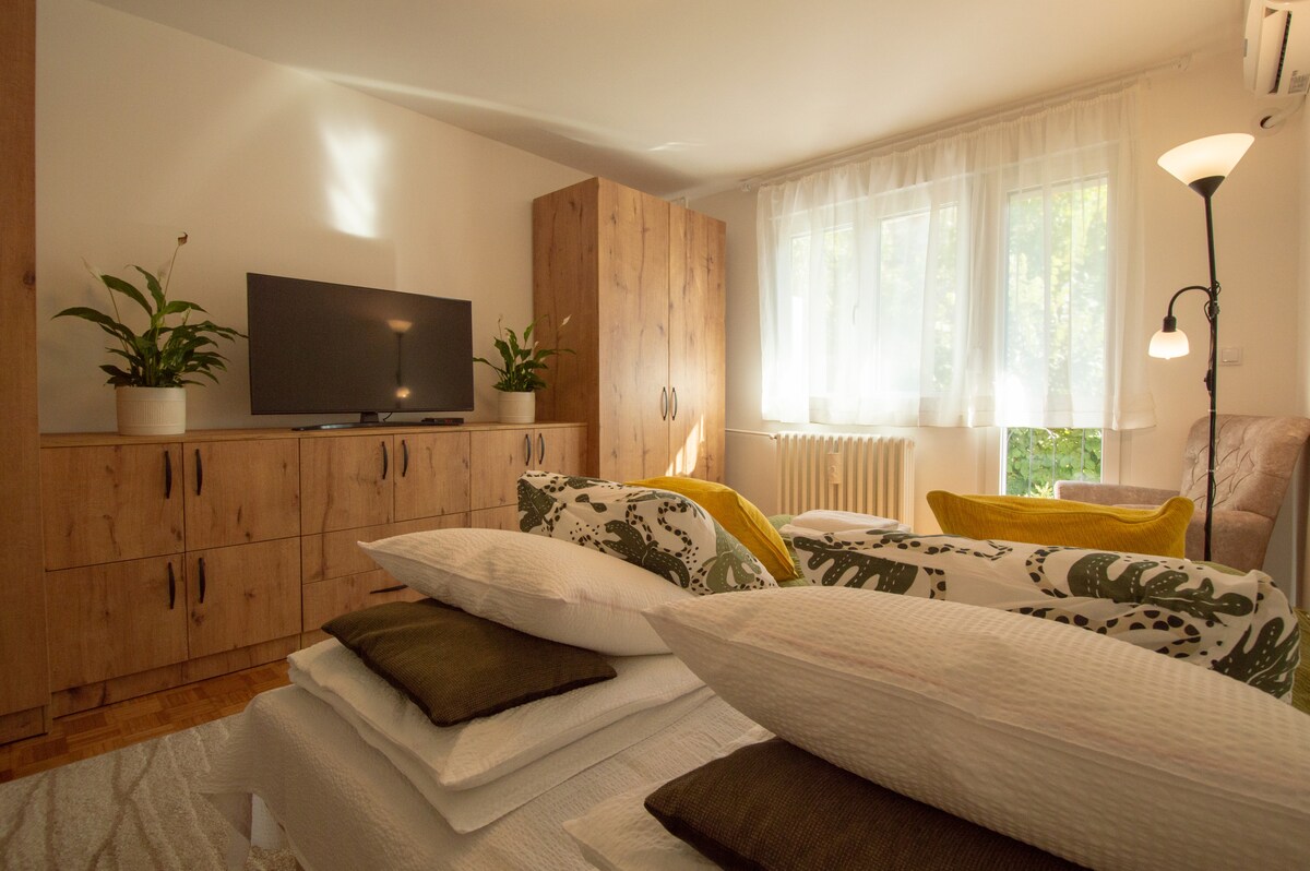 Our place is very comfortable, modern furnished, renovated apartment. It consists of one larger room, a functional kitchen, a modern bathroom and a spacious terrace that has a beautiful view of the peaceful surroundings. It's located in the wider center of Novi Sad, at a distance of about 15-20 minutes of easy walking from almost all sights in the city.