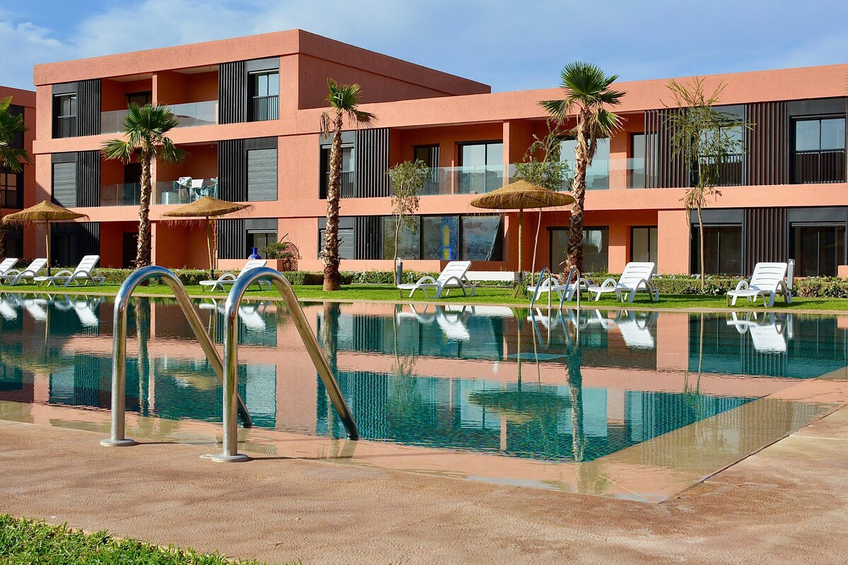 Come and enjoy this refurbished and tastefully decorated apartment. Fully equipped, quality bedding, the apartment has all the comforts for a relaxing stay with family or friends. Ideally located in a secure residence, with stunning views of the golf course. Only 5 min from the airport and 10 min from the city center of Jemaa el-Fnaa Square. The residence has, beyond its golf course, many swimming pools, restaurants and green spaces.