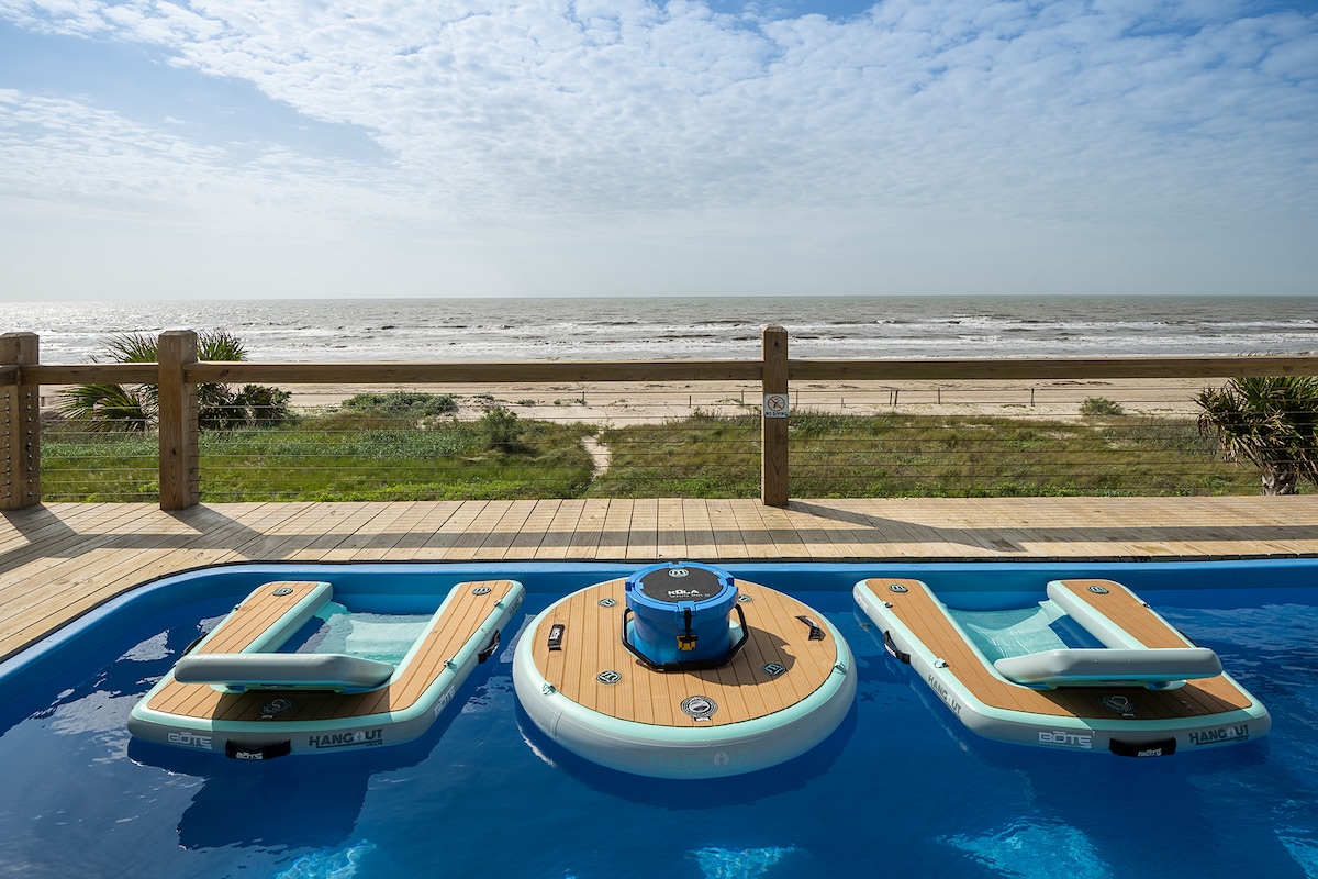 Experience elevated coastal living in this stunning beachfront retreat designed for best vacation. With a wide-space, soaring ceilings, and expansive windows framing panoramic Gulf views, natural light fills every corner. Newly built and beautifully styled with modern coastal finishes, this 4-bedroom, 3.5-bath Crystal Beach getaway sleeps 16+ and features a heated SwimSpa (pool + hot tub), private fenced yard, propane fire pit, and direct beach access—perfect for unforgettable perfect vacation.