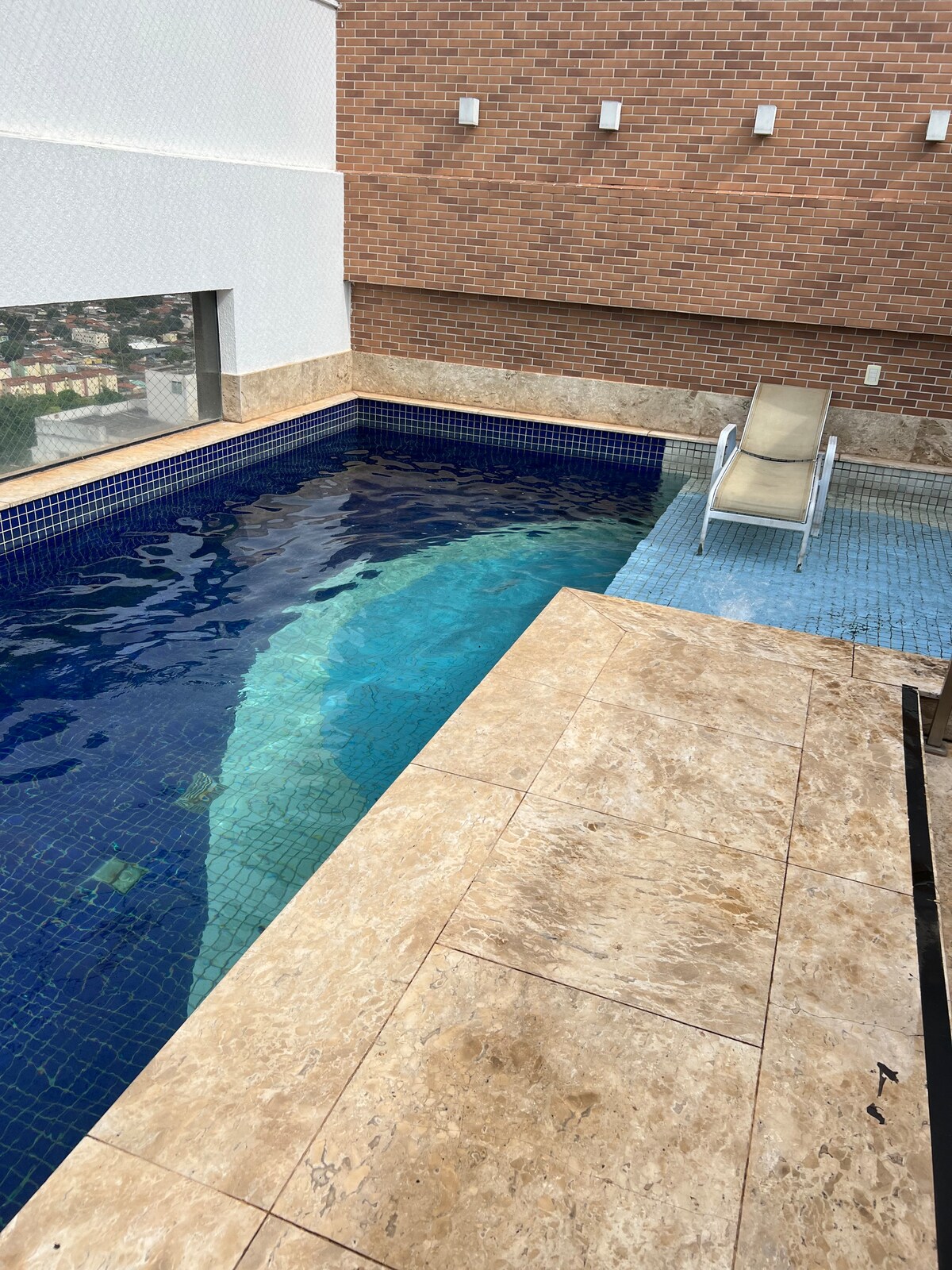 Apto 45 m2. Quarto:Cama Queen,armários,bancada escritório,TV 4K 50”,ar-cond.,roupa de cama/banho. Sala: sofá cama,TV 4K 50”,ar-cond.,mesa e 4 cadeiras design italiano. Cozinha:armários,bancada,cooktop 4 bocas,geladeira,forno elétrico,forno microonda,cafeteira elétrica,filtro água,sanduicheira, panelas,utensílios. Piscina borda infinita, hidro,sauna,academia,brinquedoteca,salão festa,espaços gourmet. 1 vaga garagem. Portaria 24 horas porteiro e segurança. Temos outro apto