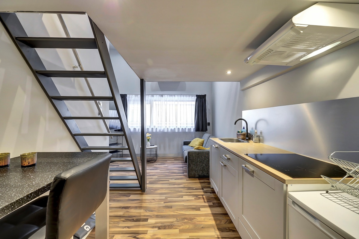Small apartment for overnight stay, equipped with basic necessities, kitchen: dishwasher, fridge, combi microwave, hob, cutlery and dishes. Bedroom with wardrobe, washer and dryer combination, small desk. Shower with sink, separate toilet. Living room with a sofa bed.