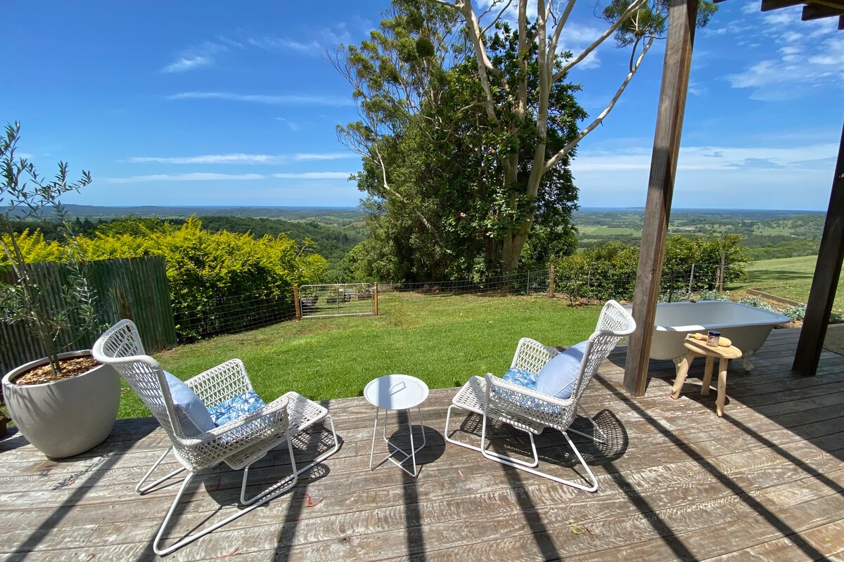 Breathtaking 270 degree distant views from sunrise to sunset. A newly built, self-contained eco villa, on a working cattle farm, providing stunning vistas of Byron Bay Hinterland from your bed! Natural lime-rendered hempcrete walls, rustic hardwood beams, & timber floors. Open plan with floor-to-ceiling glass. French doors in the bedroom open to the claw foot bath on the deck. Easy driving distance from Mullumbimby, Byron Bay, Brunswick Heads, Ballina airport and Coolangatta / Gold Coast.