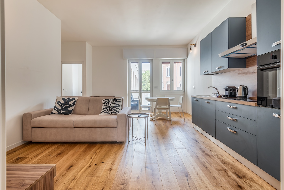 Elegant, very bright penthouse with generous private terrace, located a 5-minute walk to the station The apartment consists of: - large open space living room and kitchen, living room with sofa bed, smart TV and study corner and WI-FI - large double bedroom with king size bed, open wardrobe and safe - marble bathroom with deluxe shower - large terrace with relaxation area Located in a strategic area, a 5-minute walk from the train station to Milan and Malpensa. APARTMENT BUILT IN 2023