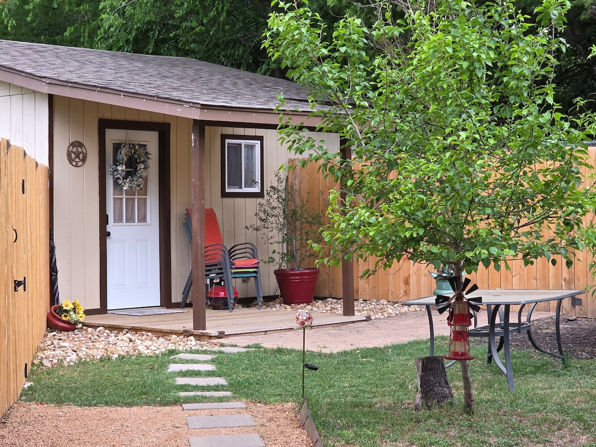 Cozy, rustic, historic, rock cottage, 240 sf. Huge front deck & scenic back deck. Old hardwood floors, vaulted tin ceiling. Mini kitchen-farmhouse sink, fridge, coffee. Queen bed. Modern mini-split heat pump cools, heats. Wood-burning stove. Set on 7-acre ranch w/hill country views,horses. Quirk Alert! Bathroom is accessed outside front door 25 paces to back of cottage. Open shower with rain head and wand. Exposed rock walls, concrete floor. No chemicals used so critter sightings possible.